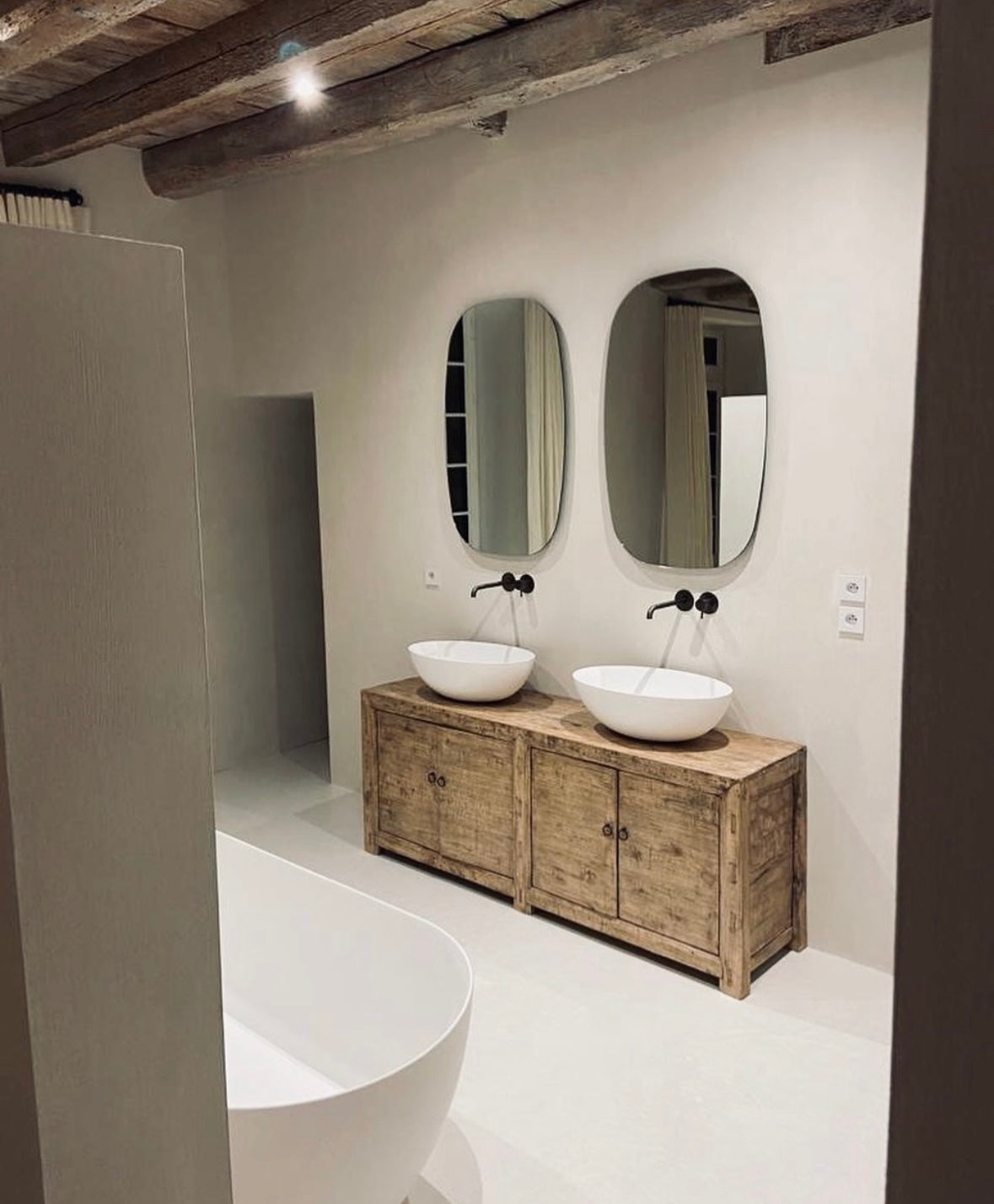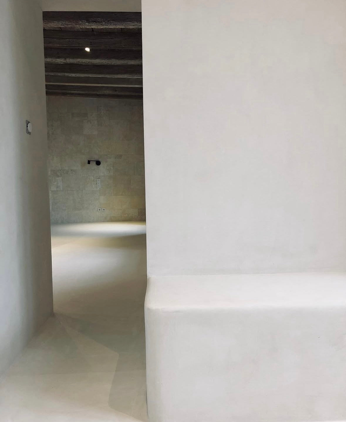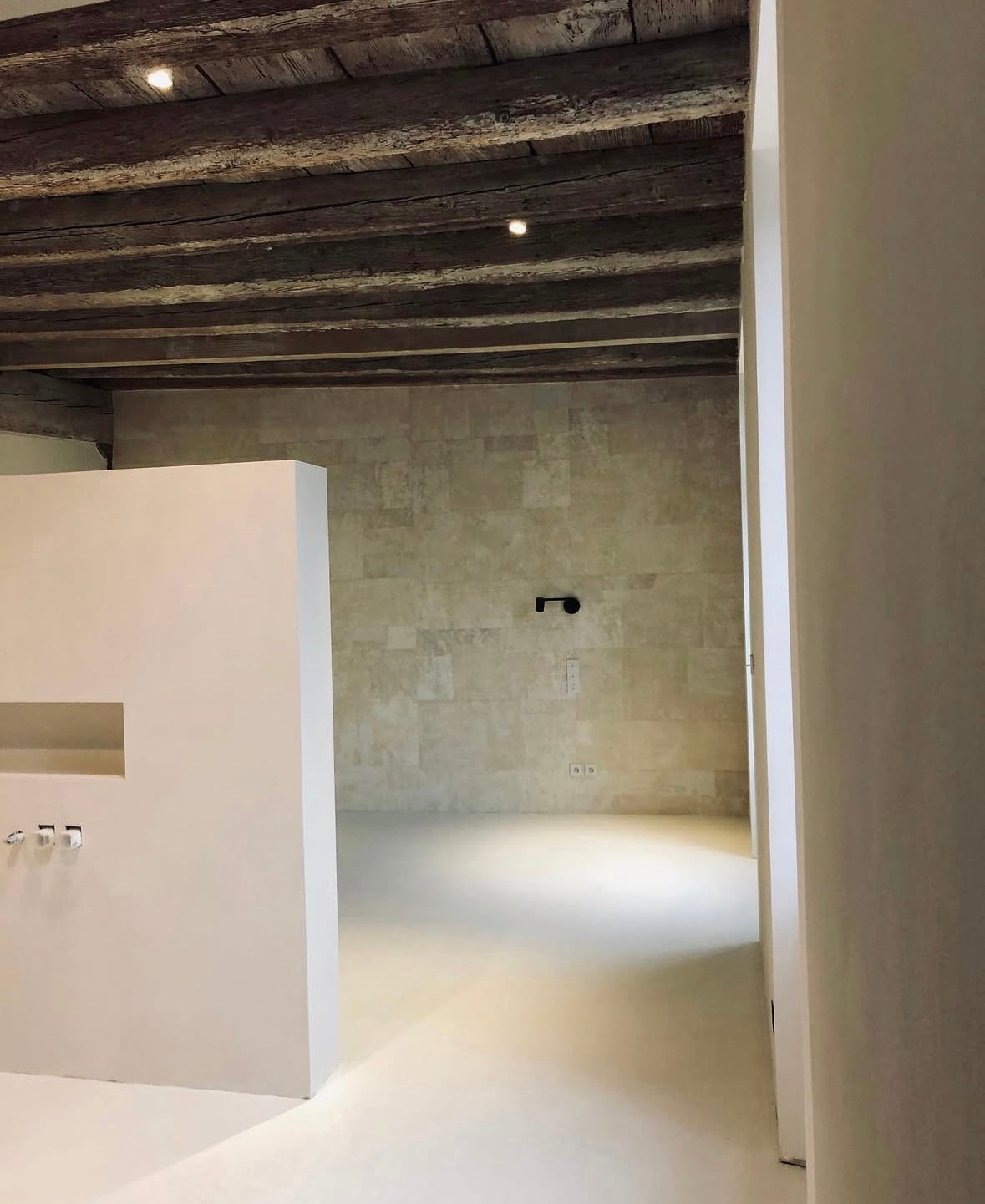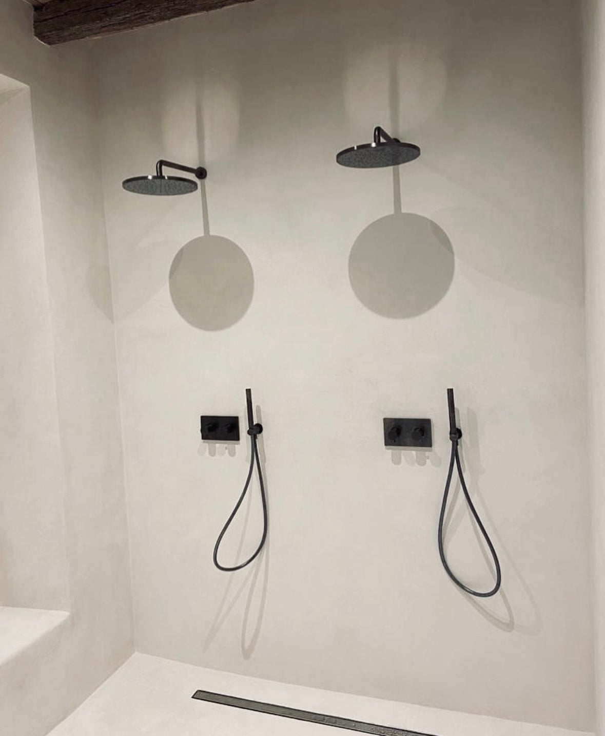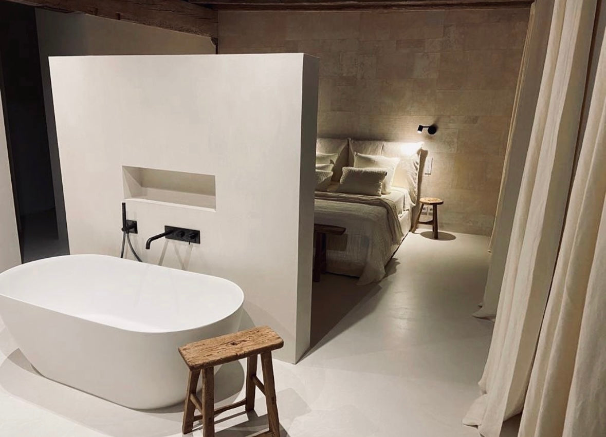 De combinatie van de beton ciré vloer en wanden geeft de ruimte een rustige en minimalistische uitstraling. De lichte tinten creëren een zachte en moderne sfeer, terwijl de robuuste houten balken en het houten badkamermeubel warmte en karakter toevoegen. Het contrast tussen het strakke stucwerk en de natuurlijke elementen zorgt voor een luxe, tijdloze beleving.