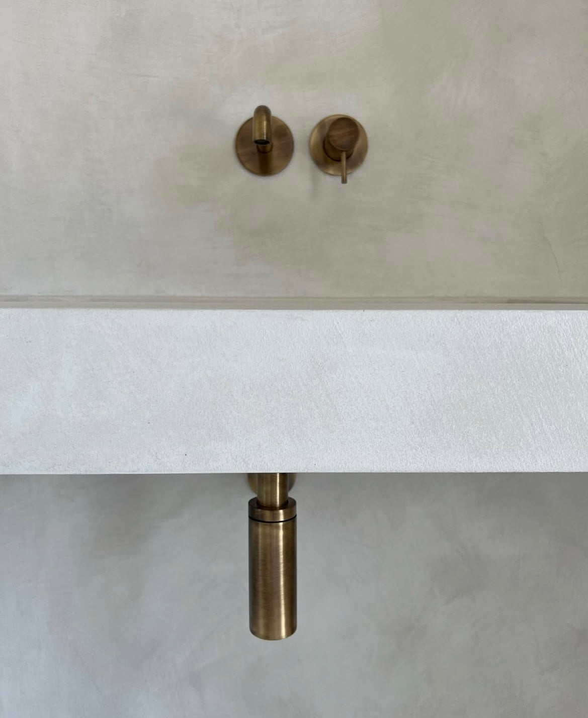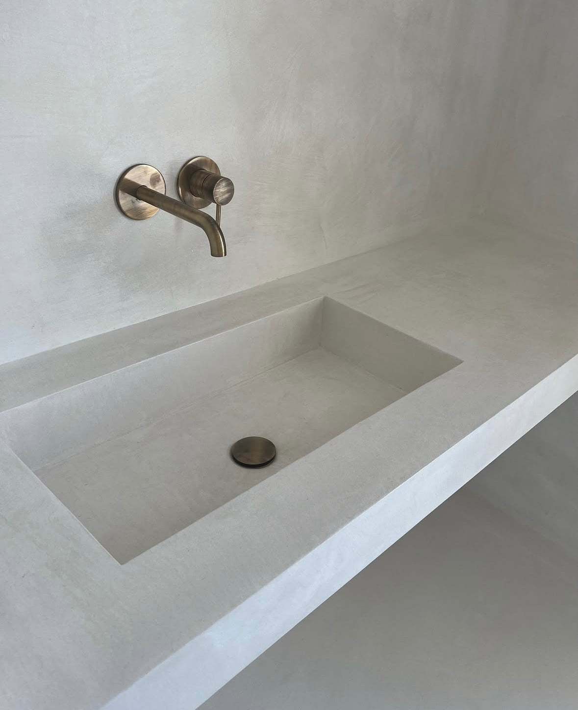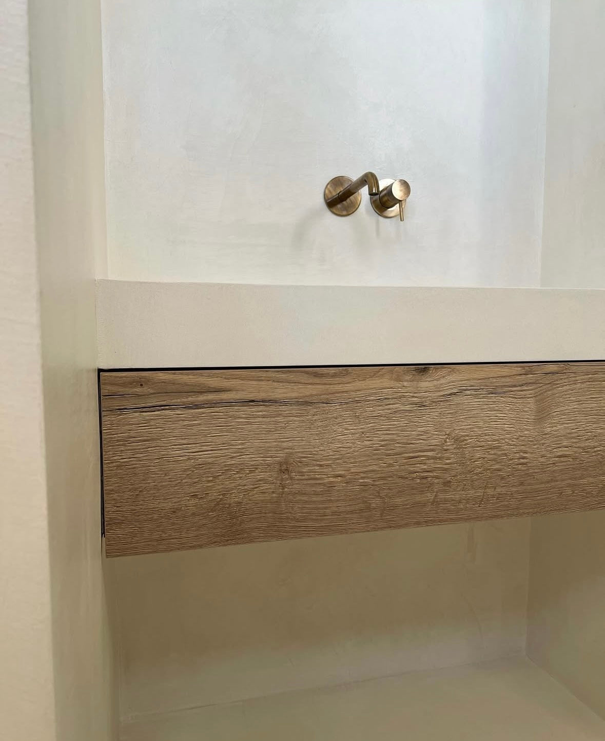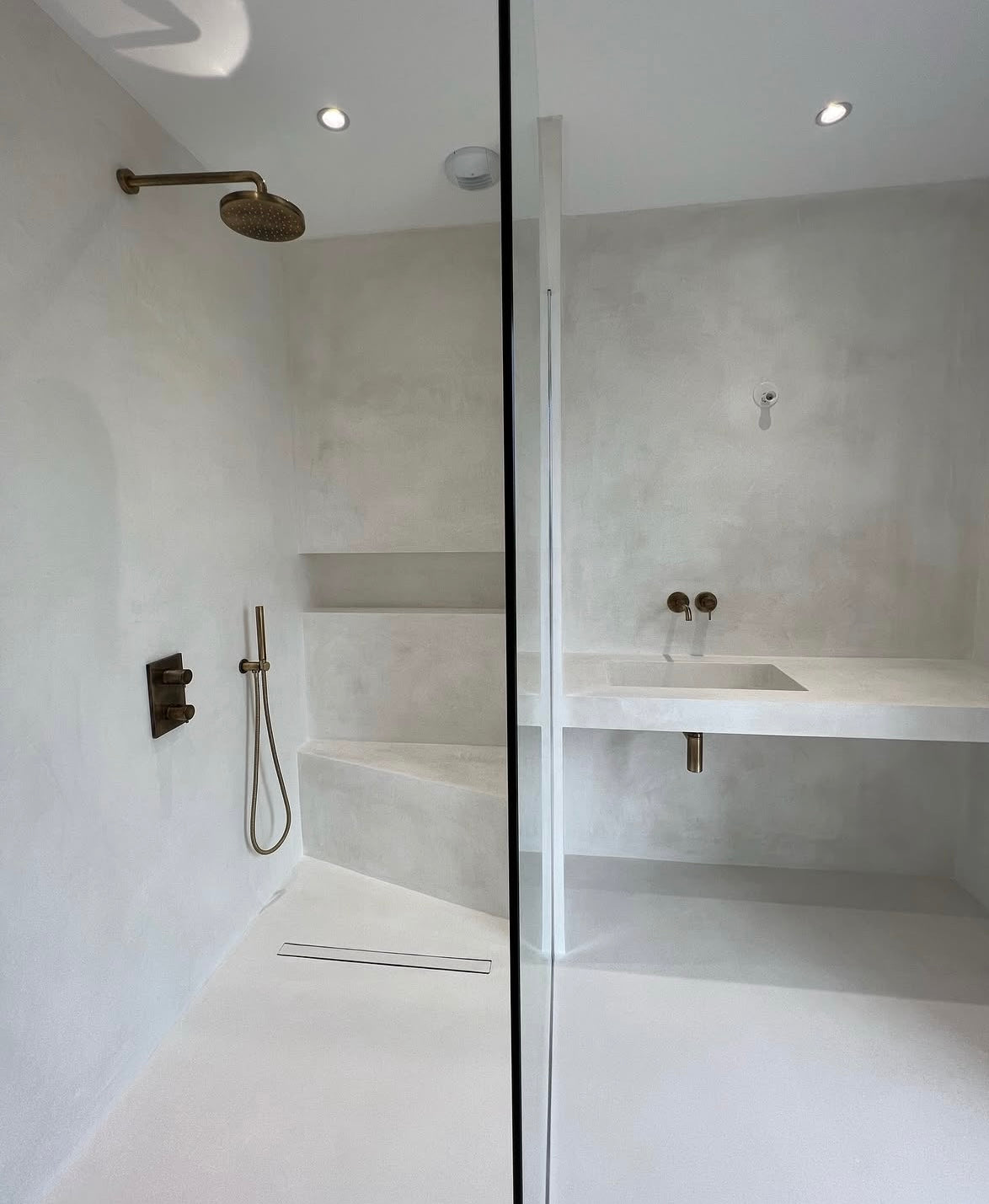 De combinatie van de zachte betonlook met de warme uitstraling van hout en de luxe bronzen kranen zorgt voor een moderne maar ook natuurlijke sfeer. De inloopdouche met geïntegreerde zitbank en nissen voegt comfort en functionaliteit toe, terwijl de strakke belijning en het gebruik van één materiaal zorgen voor rust en eenheid.